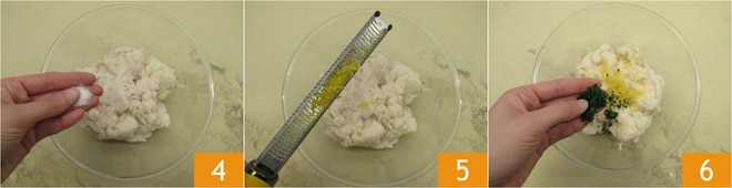 Übertragen Sie ihn in eine Schüssel und würzen Sie mit Salz 4, Zitronenschale 5 und fein gehackter Petersilie 6. Mischen Sie, um alles zu verbinden.