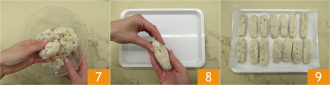 Nehmen Sie eine Portion der Masse von etwa 55 g 7 und formen Sie sie mit feuchten Händen 7, um eine flache Stange zu erhalten 8. Legen Sie die Stäbchen auf ein mit Backpapier ausgelegtes Tablett 9.