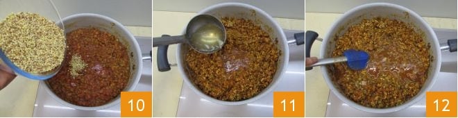 Wenn die Sauce endlich gekocht ist, die Fregula hinzufügen 10. Diese wird ähnlich wie Risotto gekocht, indem bei Bedarf eine Kelle Flüssigkeit hinzugefügt wird. Unsere kocht in etwa 30 Minuten, Sie können es nach den Angaben auf der Verpackung Ihrer Fregula einstellen. 11 Denken Sie daran, häufig umzurühren, um zu verhindern, dass die Pasta am Boden klebt 12.
