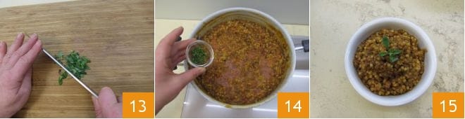 Die Majoranblätter mit einem Messer hacken 13 und über die gekochte Mischung streuen 14. Die Fregula mit Linsen ist fertig, jetzt müssen Sie sie nur noch anrichten und servieren 15!