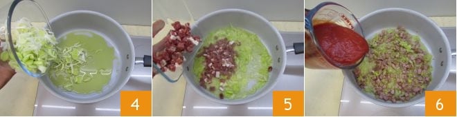 In einer Pfanne den Lauch bei niedriger Hitze 6-7 Minuten im Olivenöl köcheln lassen 4, dann die Rohschinkenwürfel hinzufügen und 2-3 Minuten kochen lassen 5. Mit der Tomatenpassata bedecken 6