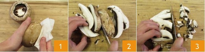 Um die Fregola mit Portobello-Pilzen zuzubereiten, bereiten Sie zunächst die Gemüsebrühe vor. Kümmern Sie sich um die Reinigung der Pilze: Schneiden Sie den Stielansatz ab und entfernen Sie die Erdreste mit einem Tuch 1, dann schneiden Sie sie in Scheiben 2 und zerkleinern Sie sie in kleine Stücke 3.