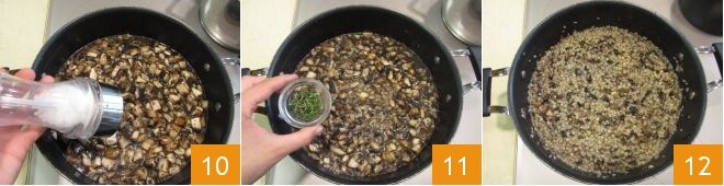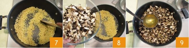 Rösten Sie die Fregola für wenige Augenblicke 7, dann fügen Sie die Portobello-Pilze hinzu 8, rühren Sie um und setzen Sie das Kochen für etwa 20-25 Minuten fort (folgen Sie den Angaben auf der Verpackung) und geben Sie nach und nach die heiße Brühe hinzu 9, je eine Kelle auf einmal, wie beim Risotto, und warten Sie, bis die Flüssigkeit absorbiert ist, bevor Sie mehr hinzufügen.