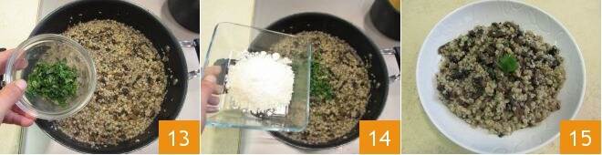 und mischen Sie mit gehackter frischer Petersilie 13 und geriebenem Käse 14. Servieren Sie die Fregola mit Portobello-Pilzen gut heiß 15.