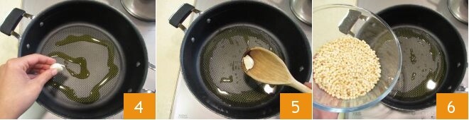 Erhitzen Sie in einem großen Topf das Öl, fügen Sie die Knoblauchzehe hinzu und lassen Sie sie bei schwacher Hitze einige Minuten anbraten, um das Öl zu aromatisieren 4, dann entfernen Sie den Knoblauch 5 und fügen Sie die Fregola hinzu 6.