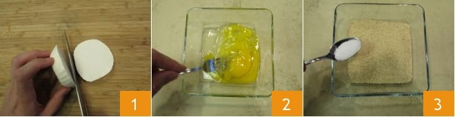 Um den gebratenen Primosale zuzubereiten, schneidet ihn zuerst in Scheiben 1. Je nach Größe des verfügbaren Primosale könnt ihr euch entscheiden, ob ihr Scheiben oder Würfel schneidet. Schlagt die Eier in einer kleinen Schüssel auf und verquirlt sie 2, dann gebt das Paniermehl in eine andere kleine Schüssel und würzt es mit einer Prise Salz 3. Schließlich gebt das Mehl in eine dritte Schüssel. Erhitzt in einem Topf das Öl auf dem Herd, bis es eine Temperatur von 165° erreicht.