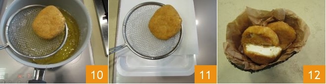 Frittiert sie etwa 4 Minuten und sobald sie goldbraun sind, nehmt den gebratenen Primosale heraus 10 und legt ihn auf ein mit Küchenpapier ausgelegtes Tablett 11. Passt die Kochzeit der Größe des Primosale an; unsere Stücke wogen etwa 160 g. Frittiert auch die restlichen Scheiben und serviert sie 12