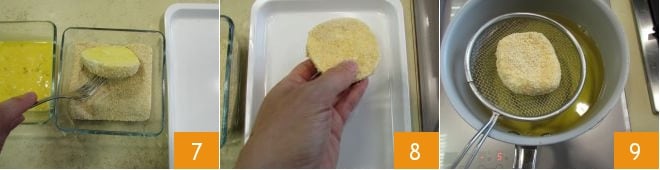 Zum Schluss wendet ihn im Paniermehl 7, sodass er von allen Seiten gut bedeckt ist. Legt ihn anschließend auf ein Tablett 8 und macht mit den anderen Scheiben weiter. Sobald das Öl die richtige Temperatur erreicht hat, taucht ihr nach und nach ein paar Stücke ein 9, um die Temperatur nicht zu stark zu senken.