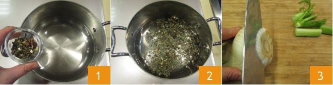 Um den gedämpften Kabeljau mit Tee zuzubereiten, stellen Sie zuerst einen Topf mit Wasser auf den Herd, fügen Sie die getrockneten Zitronenteeblätter hinzu (1-2) und bringen Sie es zum Kochen. In der Zwischenzeit nehmen Sie den Fenchel, schneiden Sie den unteren Teil ab 3,