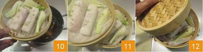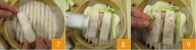 Nehmen Sie nun einen Bambuskorb zum Dämpfen, legen Sie den Boden mit einem Stück Backpapier aus. Legen Sie den Kabeljau 7 und die Fenchelspalten hinein, salzen 8, pfeffern und verteilen Sie schließlich die grünen Fenchelspitzen darüber 9. Nehmen Sie nun einen zweiten Bambuskorb und wiederholen Sie die gleichen Schritte.