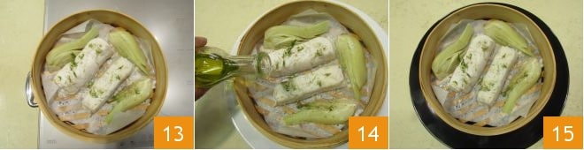 Nach dem Kochen 13 würzen Sie mit einem Schuss rohem Olivenöl 14, und servieren dann den gedämpften Kabeljau mit Tee heiß 15 zusammen mit dem Fenchel.