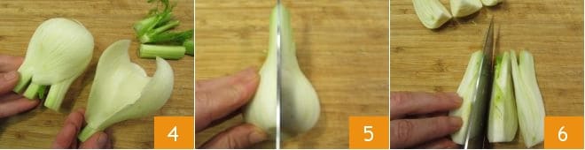 entfernen Sie das äußerste, harte Blatt 4, schneiden Sie dann das Herz in zwei Hälften 5, und teilen Sie jede Hälfte in 3 Spalten 6. Bewahren Sie die dünnen grünen Spitzen auf, die für die Zubereitung verwendet werden.