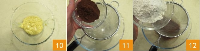 Übertragen Sie die Creme in eine Schüssel 10, lassen Sie sie abkühlen, indem Sie sie mit Frischhaltefolie abdecken, und sobald sie kalt ist, stellen Sie sie in den Kühlschrank, um sie fest werden zu lassen. In der Zwischenzeit fahren Sie mit der Zubereitung des Teigs fort: Sieben Sie das Kakaopulver 11, das Mehl 12