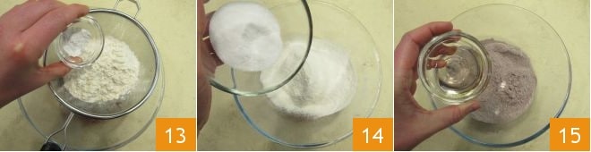 und das Backpulver 13. Fügen Sie dann den Kristallzucker hinzu 14 und mischen Sie alle Pulver. Jetzt fügen Sie zu den trockenen Zutaten den Weißwein 15