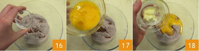 und den Grappa hinzu 16. Dann fügen Sie auch die geschlagenen Eier 17 und die weiche Butter 18 hinzu; rühren Sie mit einem Löffel