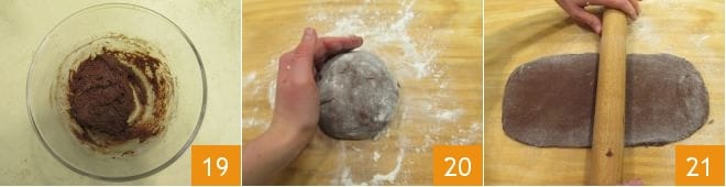 bis der Teig homogen und weich wird 19: Diese Konsistenz ermöglicht es, dass die beiden Teigschichten besser aneinander haften. Mehlen Sie die Arbeitsfläche und übertragen Sie den Teig, kneten Sie ihn von Hand, um einen kompakten Teigball zu erhalten 20, und rollen Sie dann den Teig mit einem Nudelholz aus, bis Sie eine ca. 3-4 mm dicke Teigplatte 21 erhalten.