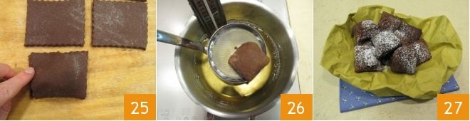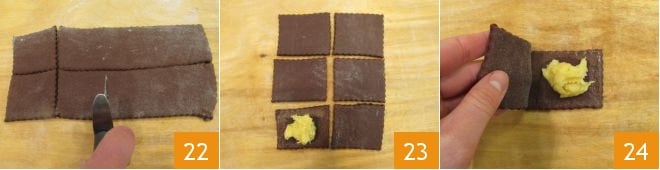 Schneiden Sie mit einem gezackten Teigschneider den Teig in Quadrate 22 (insgesamt sollten es 24 mit 6 cm x 6 cm sein); Sie können den überschüssigen Teig erneut ausrollen und die restlichen Quadrate erstellen. Befeuchten Sie die Hälfte der Quadrate mit Wasser, indem Sie nur die Ränder befeuchten, dann nehmen Sie die bereits fest gewordene Creme und füllen Sie die Quadrate, die Sie mit ein wenig Creme in der Mitte befeuchtet haben 23, mit einem anderen Teigquadrat 24