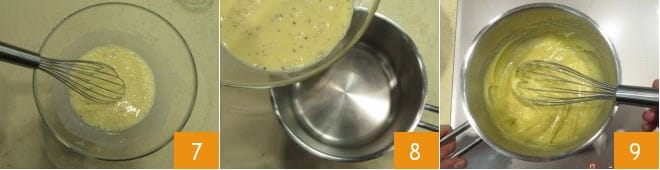 fügen Sie diese ebenfalls zu den Zutaten hinzu 4. Gießen Sie die Milch 5 und die Eigelbe 6 hinzu.