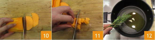 Jetzt kümmern Sie sich um die Soße. Nehmen Sie den bereits geschälten Kürbis und schneiden Sie ihn zuerst in Scheiben 10 und dann in etwa 1 cm große Würfel 11. In einem Topf geben Sie einen Schuss Öl und fügen halbierte Knoblauchzehen hinzu. Fügen Sie die Rosmarinzweige hinzu 12.