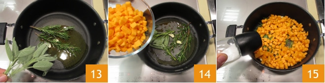 und die Salbeizweige 13. Lassen Sie es bei mittlerer Hitze 2-3 Minuten ziehen, dann geben Sie den Kürbis hinzu 14. Würzen Sie mit Salz 15.