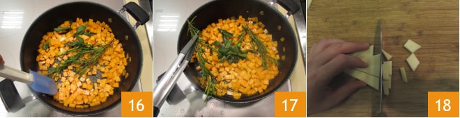 und rühren Sie gut um 16. Warten Sie ein paar Minuten, dann entfernen Sie die Rosmarinzweige 17, den Salbei und den Knoblauch. Kochen Sie den Kürbis insgesamt etwa 12 Minuten. In der Zwischenzeit schneiden Sie den Käse in Würfel 18.