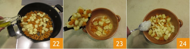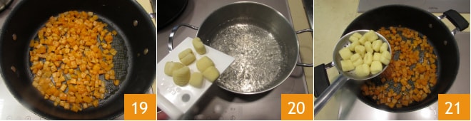 Wenn der Kürbis fertig ist 19, kochen Sie die Gnocchi nach und nach in reichlich gesalzenem kochendem Wasser 20. Sobald sie fertig sind, schöpfen Sie sie mit einem Schaumlöffel heraus und geben Sie sie in den Topf mit dem Kürbis 21.