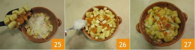 Fügen Sie einen Schuss Öl hinzu 22 und rühren Sie um. Jetzt richten Sie die Cocottes an. Insgesamt erhalten Sie vier. Legen Sie eine erste Schicht Gnocchi mit Kürbis auf den Boden 23, fügen Sie Toma-Würfel und geriebenen Grana Padano DOP hinzu 24.