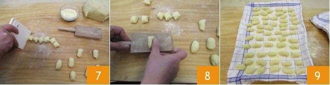 Danach schneiden Sie die Stränge in kleine Stücke 7 und drücken Sie mit leichtem Druck mit dem Daumen über ein Gnocchi-Brett, um die typische Form zu erhalten 8. Wenn Sie kein Gnocchi-Brett haben, können Sie auch eine Gabel verwenden und die Stücke über die Zinken rollen; auch hier verwenden Sie Grießmehl, um ein Ankleben zu verhindern. Während Sie die Kartoffelgnocchi vorbereiten, legen Sie sie auf ein Tablett mit einem leicht bemehlten Tuch, gut voneinander getrennt 9.