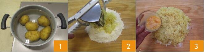 Um die gratinierten Gnocchi mit Kürbis und Toma zuzubereiten, beginnen Sie damit, letztere zu kochen. Geben Sie sie in einen Topf mit kaltem Wasser 1 und stellen Sie den Herd an. Sobald das Wasser kocht, zählen Sie etwa 30-40 Minuten, je nach Größe. Schälen Sie sie, solange sie noch heiß sind, und drücken Sie sie dann auf das Mehl, das Sie auf das Nudelbrett gegeben haben 2. Fügen Sie dann das leicht geschlagene Ei und eine Prise Salz hinzu 3.