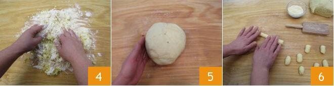 und kneten Sie alles mit den Händen 4, bis Sie einen weichen, aber festen Teig erhalten 5. Denken Sie daran, dass die Gnocchi hart werden, wenn sie zu viel bearbeitet werden, also kneten Sie nur, bis der Teig zusammenhält. Nehmen Sie einen Teil des Teigs und rollen Sie ihn mit den Fingerspitzen zu langen, etwa 2 Zentimeter dicken Strängen 6; dabei hilft es, das Nudelbrett gelegentlich mit Grießmehl zu bestäuben. In der Zwischenzeit decken Sie den restlichen Teig mit einem Tuch ab, damit er nicht austrocknet.