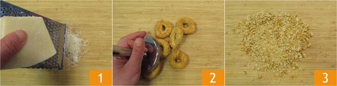 Um die Hähnchen-Bombette Cacio e Pepe zuzubereiten, beginnen Sie damit, den Pecorino zu reiben 1. Zerstoßen Sie nun die Taralli grob mit einem Fleischklopfer 2, um sie in Brösel zu verwandeln, und legen Sie sie beiseite 3.