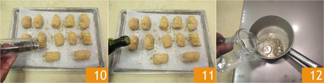 Legen Sie sie auf ein mit Backpapier ausgelegtes Blech, pfeffern Sie 10 und beträufeln Sie sie mit etwas Öl 11. Backen Sie sie im vorgeheizten Umluftofen bei 200° für etwa 20 Minuten, wobei Sie die Bombetten zur Hälfte der Garzeit wenden. Während die Bombetten im Ofen sind, bereiten Sie die Sauce zu: In einem kleinen Topf rösten Sie den bereits gemahlenen schwarzen Pfeffer für einige Minuten, sobald der Pfeffer geröstet ist, gießen Sie das Wasser hinzu und schalten Sie das Feuer aus 12.