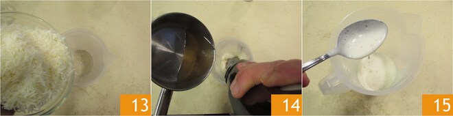 Geben Sie den geriebenen Pecorino in ein hohes Gefäß 13 und fügen Sie das inzwischen lauwarme Wasser hinzu 14, pürieren Sie mit einem Stabmixer, um eine glatte Sauce zu erhalten 15.