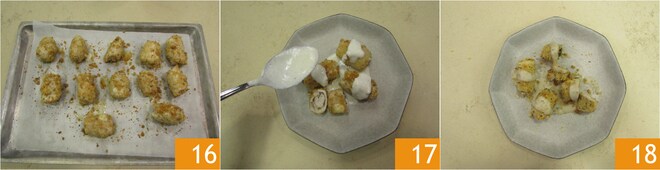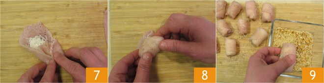 Falten Sie die seitlichen Enden nach innen 7 und rollen Sie die Scheibe, um die Roulade zu formen 8. Mit diesen Mengen erhalten Sie 12 Stück. Wenden Sie die Rouladen in den zerbröselten Taralli 9.