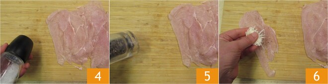 Nehmen Sie eine Scheibe Hähnchen, salzen 4 und pfeffern Sie sie von beiden Seiten 5. Füllen Sie die Mitte mit etwa 5 g Pecorino und einer Prise Oregano 6.