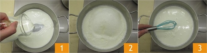 Um die Kochsahne vorzubereiten, geben Sie die Milch in einen breiten Topf 1. Schalten Sie das Feuer an und bringen Sie die Milch zum Kochen 2. Sobald sie zu kochen beginnt, rühren Sie mit einem Schneebesen um 3.