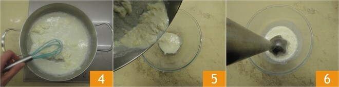 Kochen Sie insgesamt etwa 20 Minuten bei mittlerer bis hoher Flamme und rühren Sie gelegentlich um. Sorgen Sie sich nicht um die Klumpen, die sich bilden 4. Lassen Sie die Milch reduzieren, bis sie anfängt, sich zu verdicken und eine elfenbeinfarbene Farbe annimmt. Ihre Sahne ist fertig, wenn sie beim Wiegen 150 g wiegt, dann ist sie ausreichend reduziert. Geben Sie sie in eine Schüssel 5 und pürieren Sie sie mit einem Stabmixer 6, bis sie glatt ist.