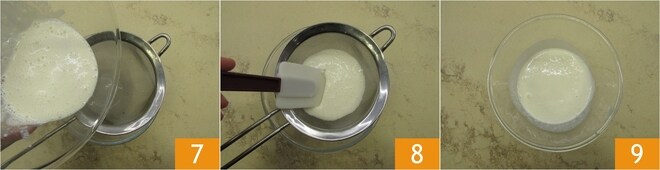 Gießen Sie sie in ein Sieb, das Sie auf eine Schüssel gestellt haben 7, und filtern Sie sie. Helfen Sie sich mit einem Teigschaber 8. Die hausgemachte Kochsahne ist fertig 9, verwenden Sie sie sofort oder decken Sie sie mit Frischhaltefolie ab und bewahren Sie sie im Kühlschrank auf, bis Sie sie verwenden.