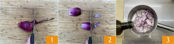 Um die herbstliche Reis-Bowl zuzubereiten, beginnen Sie mit dem Zwiebel-Topping. Schälen Sie die Zwiebel 1 und schneiden Sie sie in feine Streifen 2. Geben Sie sie in einen kleinen Topf mit einem Schuss Öl 3.