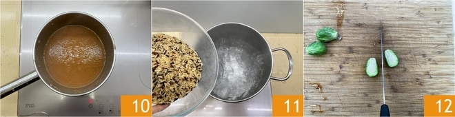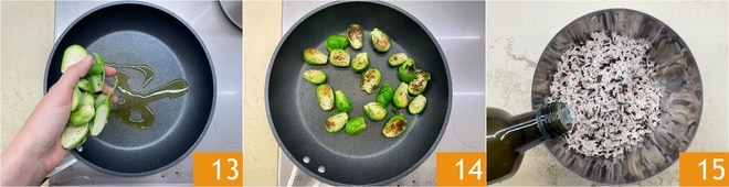 Geben Sie die Rosenkohl in eine Pfanne mit einem Schuss Öl 13 und braten Sie sie bei starker Hitze an; dies dauert etwa 10 Minuten. Wenn sie schön goldbraun sind 14, schalten Sie die Hitze aus und stellen Sie sie beiseite. Sobald der Reis gekocht ist, lassen Sie ihn abtropfen, geben Sie ihn in eine Schüssel und würzen Sie ihn mit einem Schuss Öl 15.