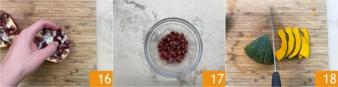 Teilen Sie den Granatapfel in zwei Hälften und entkernen Sie ihn 16, indem Sie die Kerne in eine Schüssel sammeln 17. Nehmen Sie nun den Kürbis und schneiden Sie ihn in Scheiben von einem halben Zentimeter, ohne die Schale zu entfernen 18.