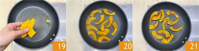 In einer Pfanne einen Schuss Öl erhitzen, den Kürbis hinzugeben 19 und für 4-5 Minuten anbraten 20. Dann drehen Sie ihn und beenden Sie das Garen auch auf der anderen Seite für die gleiche Zeit 21.