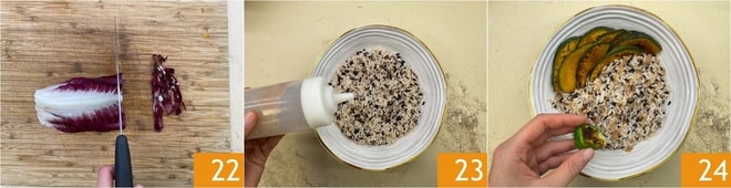 Schneiden Sie den Radicchio in feine Streifen 22, waschen und trocknen Sie ihn. Jetzt ist es an der Zeit, Ihre Bowl zusammenzustellen: Geben Sie den Reis in die Schüssel und eine großzügige Menge Zwiebel-Topping darüber 23. Platzieren Sie dann an unterschiedlichen Stellen den Kürbis und den Rosenkohl 24.