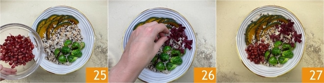 Fügen Sie auch den Granatapfel 25 und den Radicchio hinzu 26. Ihre herbstliche Reis-Bowl ist bereit, bei Raumtemperatur oder auch kalt serviert zu werden 27.