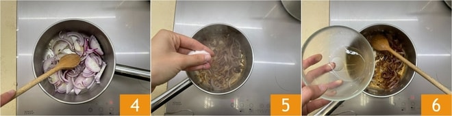 Rühren Sie um 4 und lassen Sie sie bei hoher Flamme garen, bis sie weich ist. Fügen Sie den Zucker 5 und den Essig 6 hinzu.