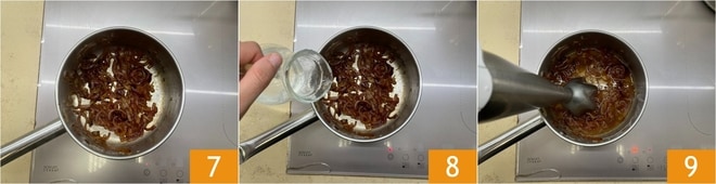 Rühren Sie um, lassen Sie es verdampfen 7, und geben Sie auch das Wasser hinzu 8. Kochen Sie noch einige Minuten, bis sie weich sind. Pürieren Sie mit einem Stabmixer 9.