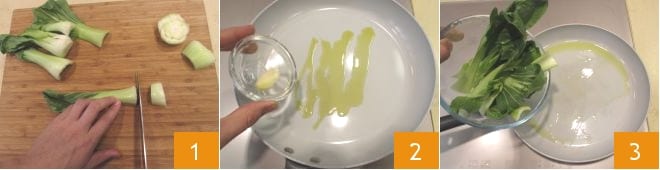 Um die herzhaften Röllchen mit weichem Kern zuzubereiten, beginnen Sie damit, den Pak Choi zu waschen und den Stielansatz zu entfernen 1. Lassen Sie den Knoblauch in dem in einer Antihaftpfanne erhitzten Öl anbraten 2, und fügen Sie dann den Pak Choi hinzu 3.