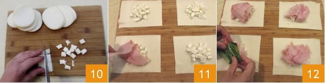 Schneiden Sie den Käse in etwa 1 cm dicke Scheiben und daraus Streifen und schließlich Würfel 10. Kümmern Sie sich nun um die Zubereitung der Schinkenröllchen: Nehmen Sie ein Blatt Blätterteig und schneiden Sie es in 4 Teile. Verteilen Sie in der Mitte jedes Quadrats die Scamorza-Würfel und den Schinken 11. Fügen Sie den Pak Choi hinzu 12.