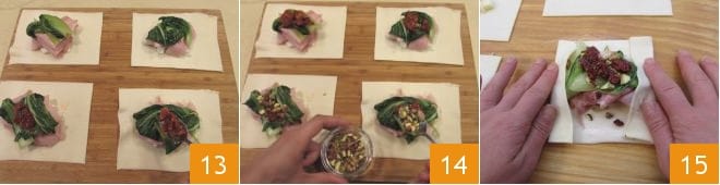 Dann verteilen Sie auch die getrockneten Tomaten 13 und die Pistazien 14. Jetzt ist es an der Zeit, die Taschen zu schließen: Nehmen Sie die beiden seitlichen Ränder und klappen Sie sie über die Füllung nach innen 15.