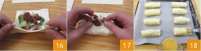 Nehmen Sie dann den unteren Teigrand und klappen Sie ihn ebenfalls über die Füllung 16 und rollen Sie weiter 17, bis Sie Röllchen erhalten. Verfahren Sie genauso mit den vegetarischen Röllchen: Sie werden mit Scamorza, Pak Choi, getrockneten Tomaten und Walnüssen gefüllt. Legen Sie schließlich die 8 erhaltenen Röllchen auf ein mit Backpapier ausgelegtes Blech und bestreichen Sie sie mit dem leicht verquirlten Ei 18.
